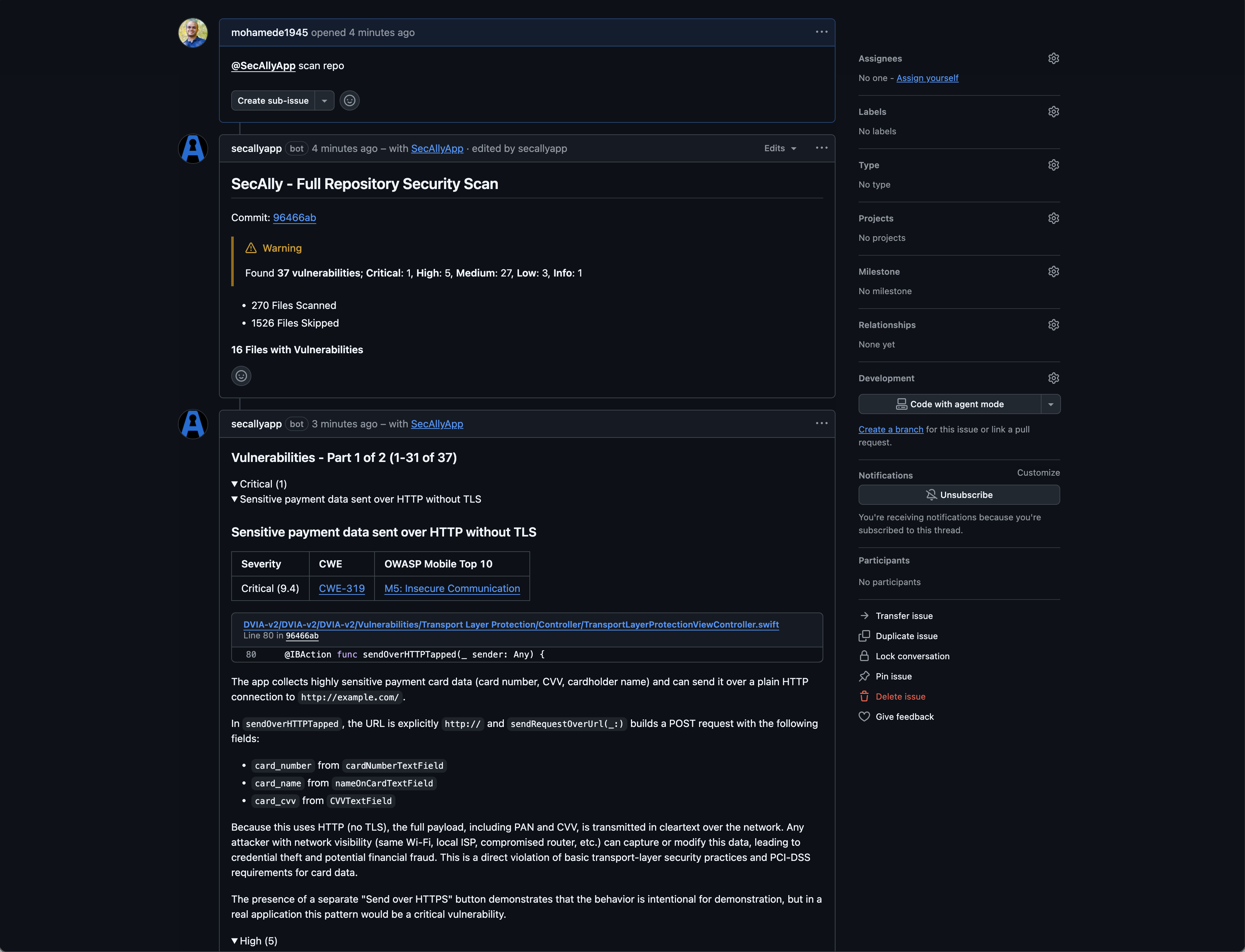 Tag SecAlly in a GitHub issue to run a full scan. See the results right in GitHub.
